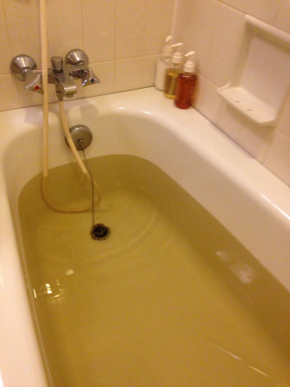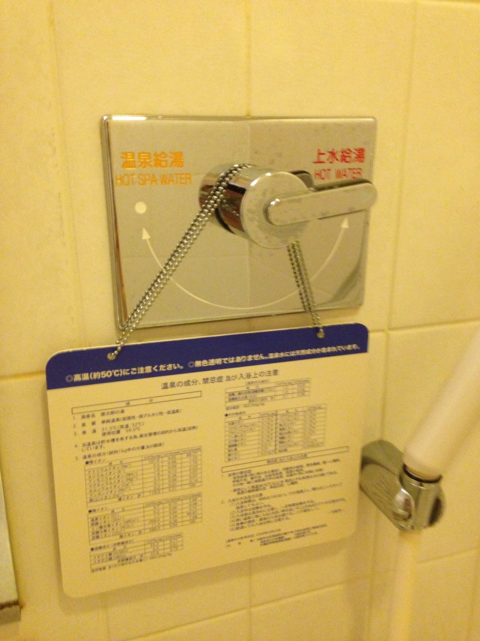 浴室のレバー?でお湯か温泉かを調節できます。褐色の温泉です。気持ち良く温まることができました。