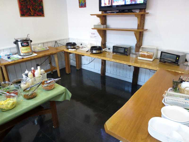 朝食はサラダと目玉焼きがあり、他ホテルのパンと飲み物のみの軽朝食よりはワンランク上です。目玉焼きはホットプレートが用意されていてセルフサービスで作ります。