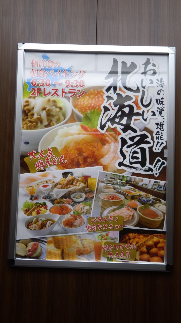 通りからすぐ入ってフロントです。ここの女性の対応がよく、素敵な笑顔で迎えられます。部屋は狭いですが、シティーホテルとしてはうまくまとまっており、いい感じです。部屋のスリッパが「ウォッシャブル」との事で気持ちよかったです。噂の朝食はさすがに良かったです。北海道ならではのメニューが豊富にありました。どれも美味しかったです。「蟹あし」はうまくできた人工ものでした。