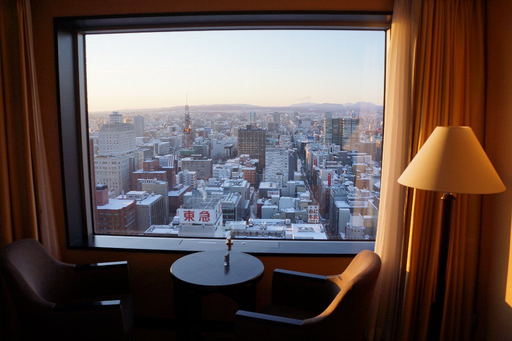 眺望最高です。碁盤目の札幌市内が眼下に広がります。また夕暮れや朝日の光景は忘れられない素晴らしさです。ホテルとしては、格式の高いハイグレードホテルなので、文句無しです。また、このホテルの凄いところは、温泉スパがあることです。別料金になりますが広々とした温泉浴槽にゆっくりと浸かることが出来ます。窓が曇りがちなので、風呂から夜景という程ではありませんが、それなりに贅沢を味わえます。