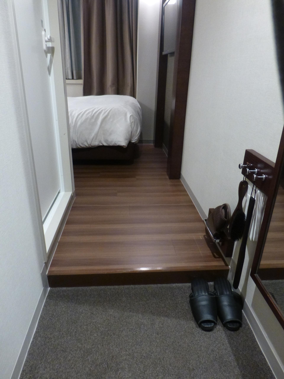 2階でチェックインを済ませて客室階に上がると、随分部屋の扉がいっぱいあるという印象。中に入ると、部屋の小ささにびっくりでした。大きめのスーツケースを持参している人は足の踏み場が無くなります。