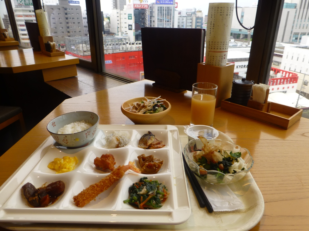 朝食は9階の和風なレストラン。内容はなかなか良いし、周辺の景色を眺めながら楽しめます。ビルの1階にはマックとファミリーマート。向かいには24時間のデニーズがあります。Wi-Fiはもちろん無料で、大浴場まで備えています。部屋の狭ささえ気にならなければ快適に過ごせるでしょう。