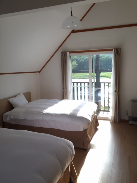 ホームページでコテージのレイアウトを見た時には2階はベッドしかなさそうだったので屋根裏みたいな狭い部屋を想像していたのですが、予想をはるかに上回るきちんとしたベッドルームがありました。階段を上がったところに、長期宿泊者は重宝するであろう、ベンチと丸いテーブルの置いてあるちょっとしたスペースがあり、左にはベッドルームへ続く渡り廊下。ベッドルームへ入ると、真っ白なリネンがピンと張られたダブルサイズ(だったと思います)のベッドがじゅうぶんなスペースを挟んで2台。小型犬では飛び乗れない高さがあります。枕が一つずつしかありませんでしたが、マットレスは固めで羽根布団はふかふか。スイートの名に恥じないベッドでした。