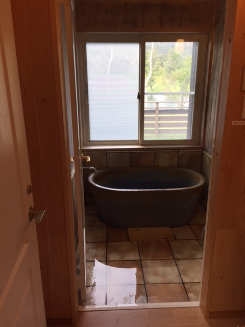 そして、お風呂。当初は大浴場を利用するつもりでしたが、客室でも温泉に入れるということで、夜は大浴場、翌朝はお部屋のお風呂に入りました。蛇口から温泉が出るって素晴らしい。コテージの水回りというと水量が少なくシャワーに勢いがなかったり、換気が不十分で木が朽ちていたりしますが、そんなことはなく、石で出来た楕円形の浴槽も十分な大きさがあり、洗い場も広く、不便なところは一切ない、快適なお風呂でした。スイート以外のコテージはシャワーのみだそうで、手術跡を気にして大浴場へ行かなかった母にも温泉を楽しんでもらうことが出来て良かったです。