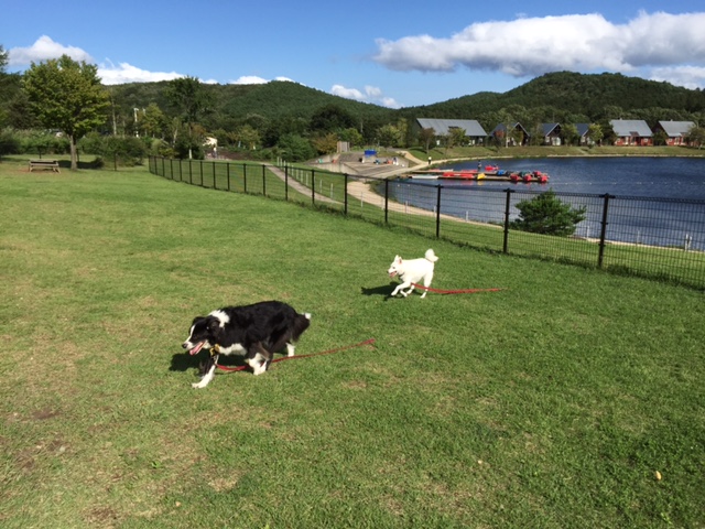 最後にプライベートラン(お庭)。我が家はボーダーコリーを含む中型犬3頭ですが、芝生で、かつじゅうぶんな広さもあり、それぞれ探検したり、走り回ったり、テラスでお昼寝したり、思い思いに過ごしていました。湖に面していて、フェンスの向こう側を他のワンちゃんがお散歩していたりするのですが、フェンスに高さがあるので、飛び越える心配もなく、安心して庭に出しておけます。また、フェンスの扉を開けて湖畔に出られるのはとても便利です。早朝、コテージの玄関から散歩に出て行った母と犬たちが庭から帰ってきたのですが、散歩にちょうど良い距離だったと言っていました。