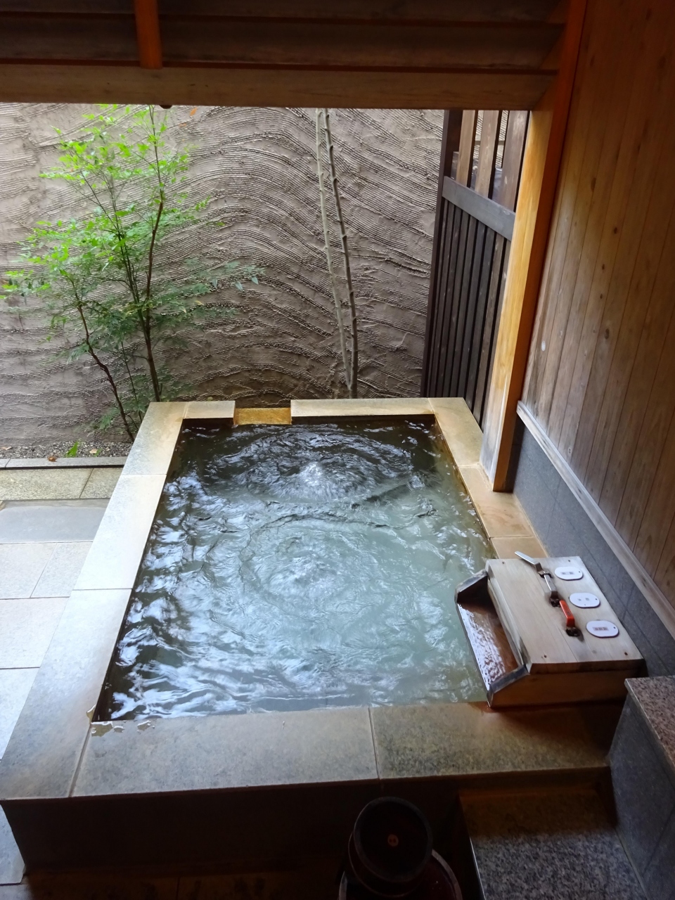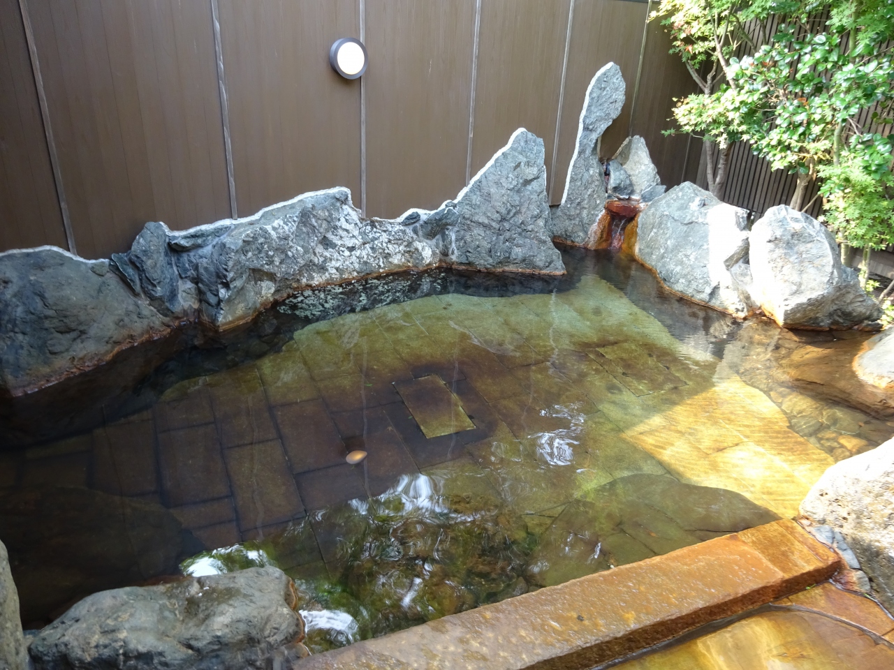 離れには広い半露天風呂があります。大浴場にも内湯と露天があり、24時間入り放題です。食事がないので、温泉三昧でした。