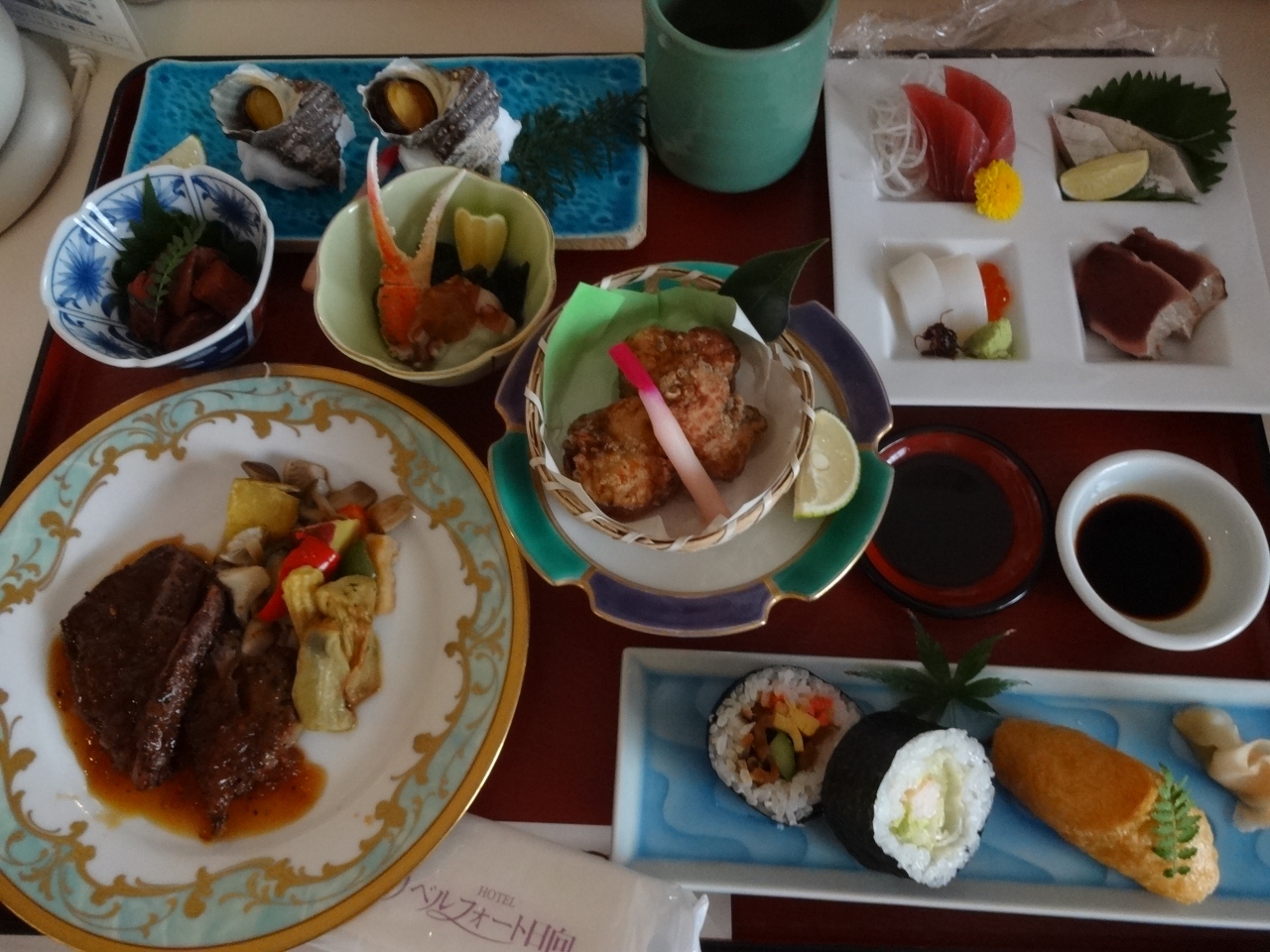 ふるさとークーポンを使っているので、半額です。夫婦ですけどシングルを2部屋取りました。私の方はランクアップされていて、ツインで快適でした。食事は私だけ付けました。魚アレルギーですが、夕飯は魚料理しか無く、アレルギーのことを予約の時に書いたら、予定の物とは違うもを揃えていただいたようで、安心して食べれました。朝食はバイキング、種類も多く楽しめました。