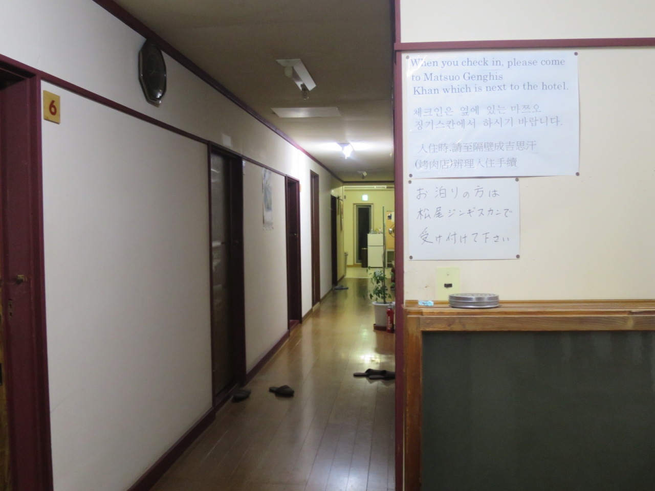 建物に入ると、管理人室が横にありますが、閉鎖されていて、「宿泊は隣の松尾ジンギスカンで受付」とありました。