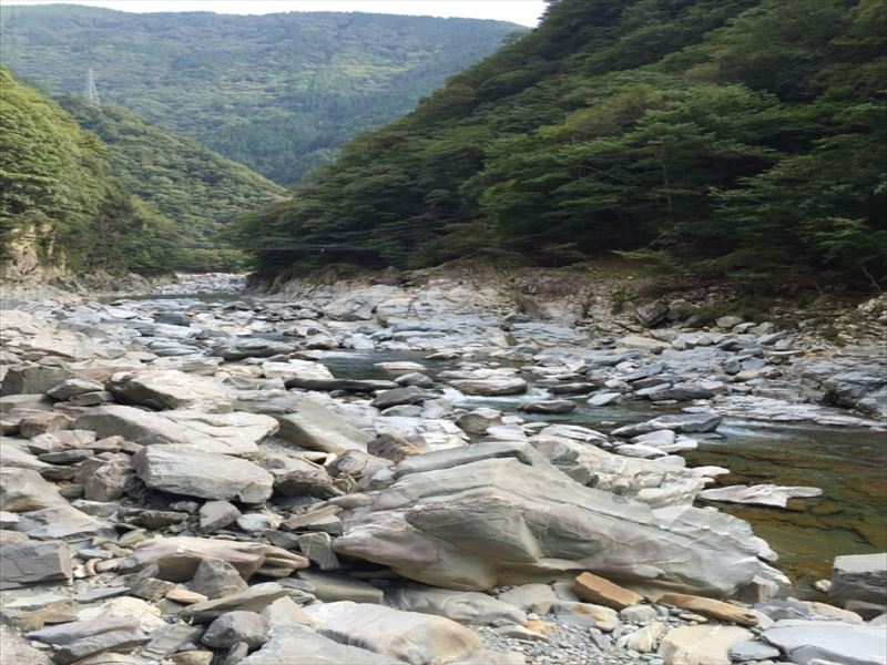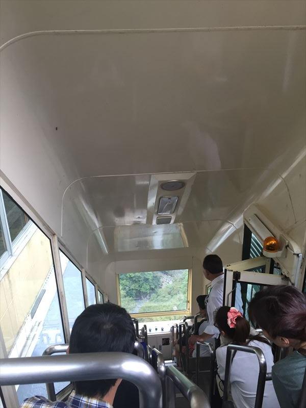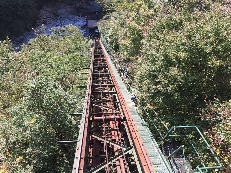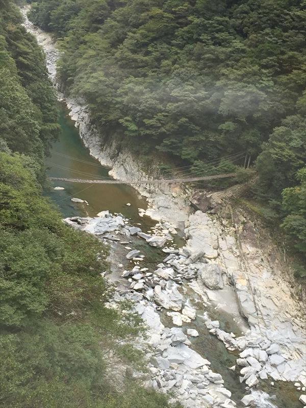 13時40分からケーブルカーに乗り露天風呂へ、洗い場は無く源泉かけ流しの浴槽のみ、大量の湯が惜しげもなく川へ放流されている。かなり温めで45分の長湯でものぼせない。推定38℃。目の前には川と山、左手に吊り橋、素朴な景色が実に癒される。