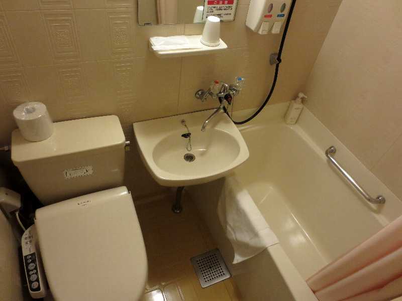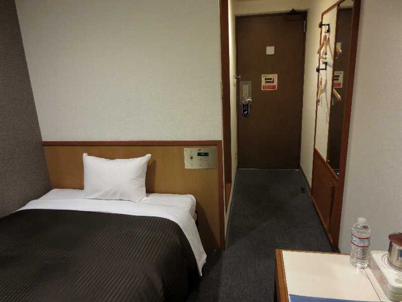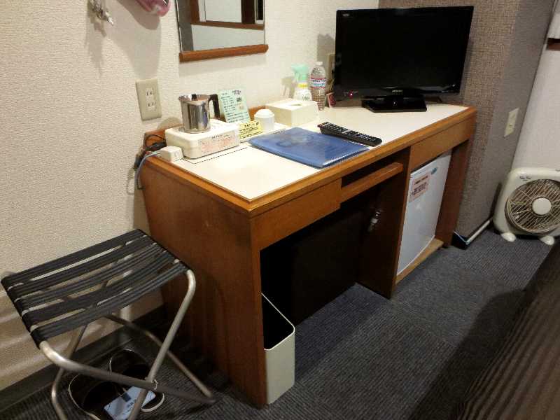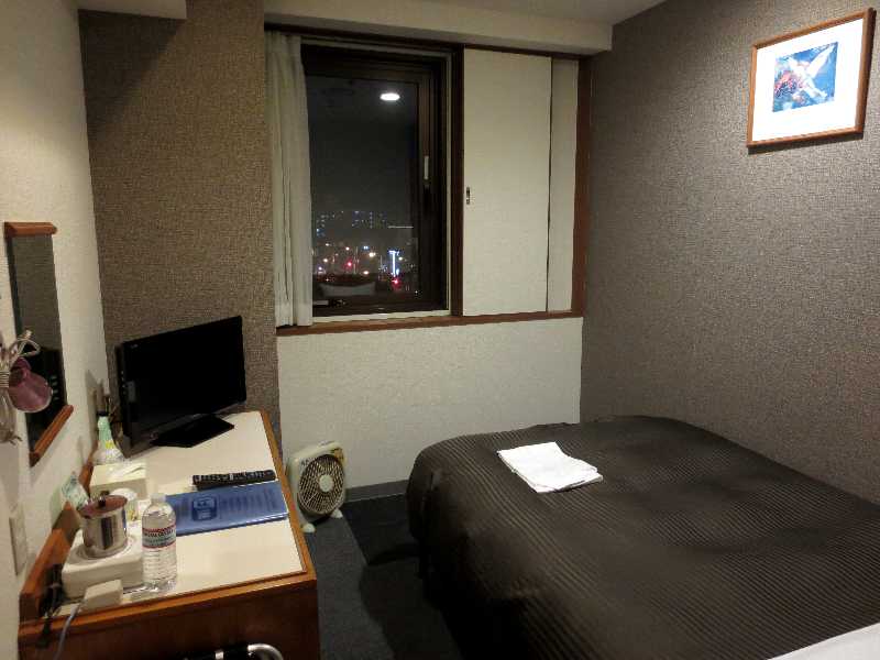 当ホテルの建物の外観は特に新しくもなく古くもなく普通ですが、内装は綺麗でした。シングル部屋の広さも格安ビジホの中では広い方です。並の格安ビジホだと狭いデスクの上に旅行カバンを置くしかないので、デスクで本も読めませんが、ここのシングル部屋は、ビジネスマンがちゃんと仕事の出来る程度の広さがあるデスクの横に、旅行カバンを置く専用台が用意されています。各部屋には有線LAN端子があります。無線LANの電波も入ります。冷蔵庫も扇風機もあります。