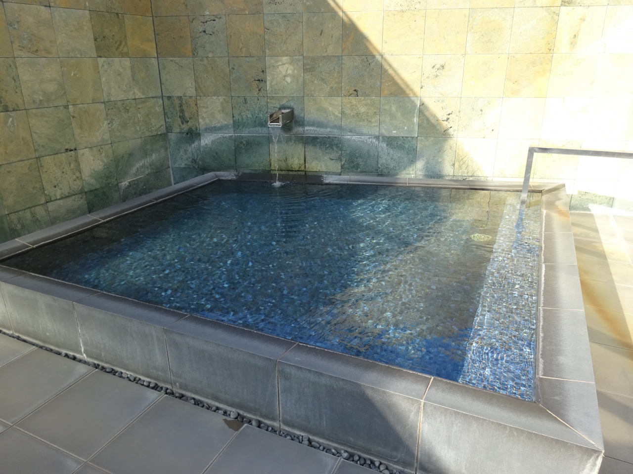 お風呂は広い内湯とサウナ、外に出ると露天と陶器風呂があります。ちょうど人が入り始める少し前の時間帯で、独占状態でした。宿泊者のように使ったタオルを使用済みタオル入れに入れて、後は冷水と梅を楽しみます。