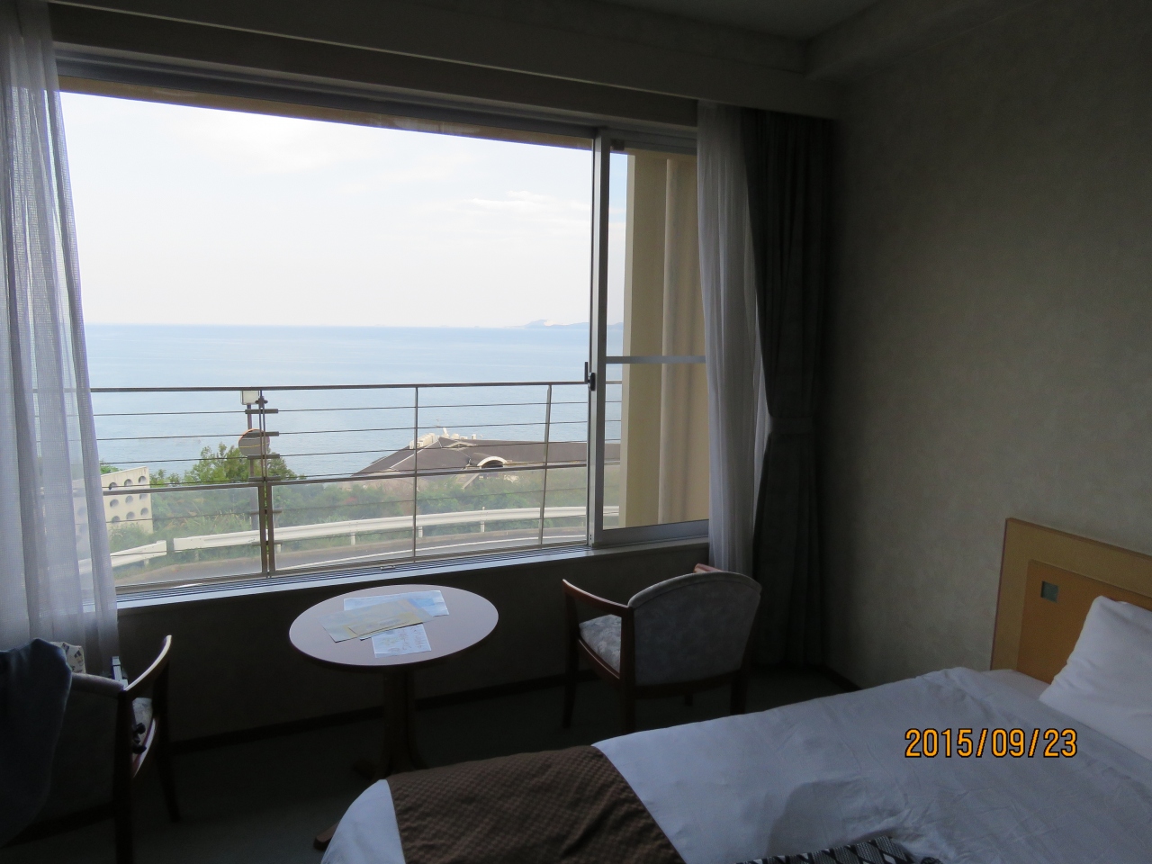 ホテルパンフレットのフレーズが「全室オーシャンビュー」で、まさしくその通りで窓からは”家島諸島”が見え、夜景は遠くに姫路の灯りがこうこうと見えきます。室内(ツィン)はかなり広く、壁紙もキレイで、清掃も行き届いており清潔感の客室でした。