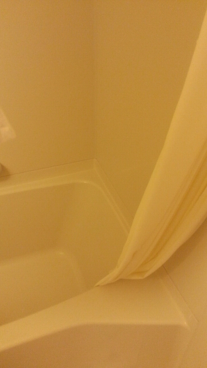 浴槽は浅めですが横幅が広くゆったりサイズです。なぜこんなに広いの?ってよく見てみると、浴槽内に垂れるカーテンが浴槽の垂直位置になく、向こう側に約15センチ位はみだしているんですね。そのため、カーテンに全く触れることなくシャワーを浴びることができます。