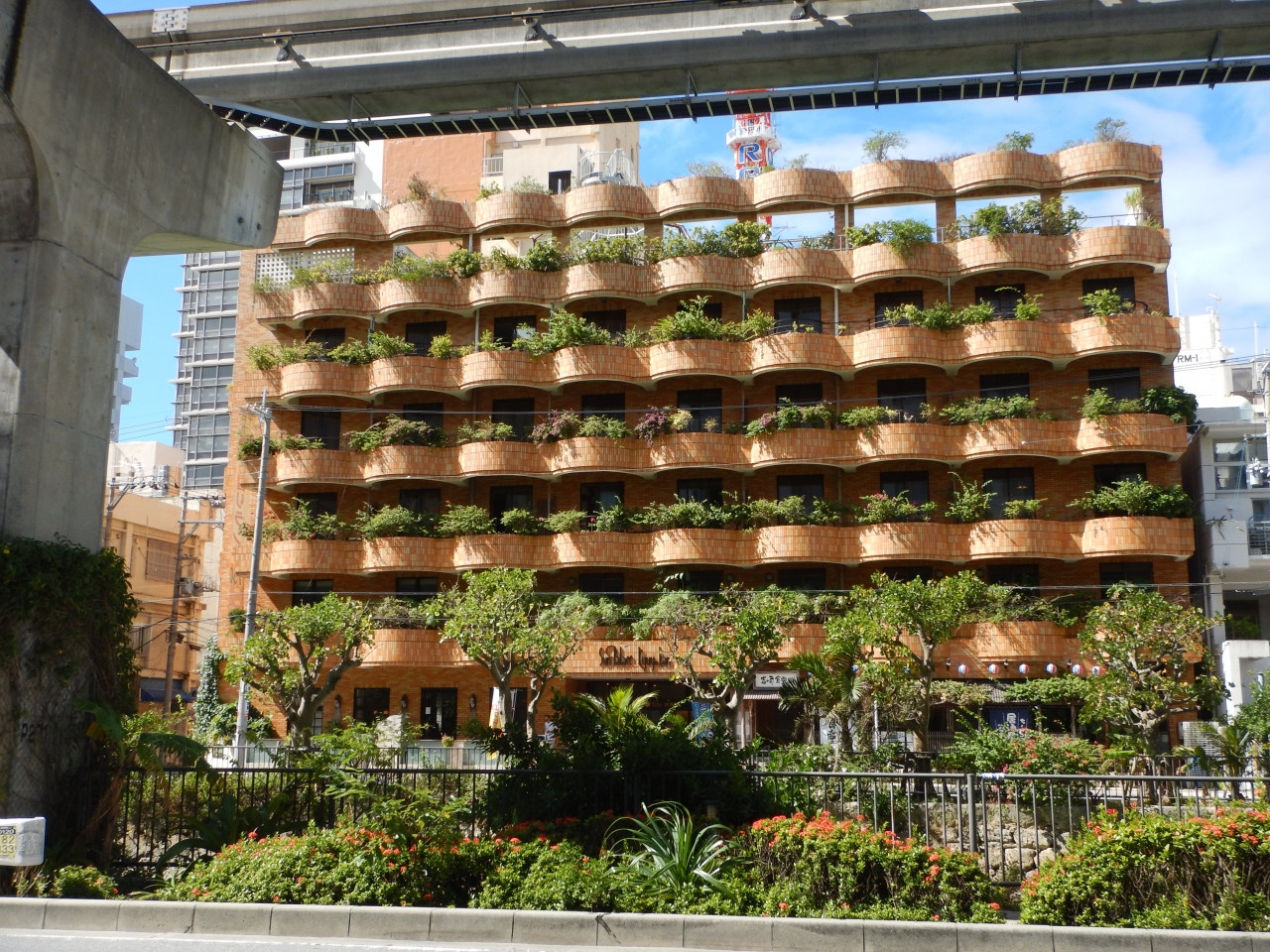 ゆいレール県庁前駅から歩いて2、3分でホテルに着きます。かなり昔からあるホテルですが、特に問題はなく快適でした。シングルの部屋も新しいホテルのシングルよりは少し広めに感じました。1番良いのは、かりゆしウェアが無料で、借りられることです。他のホテルでもレンタルはできますが、有料でした。ベランダの緑がとてもきれいで、印象に残っています。