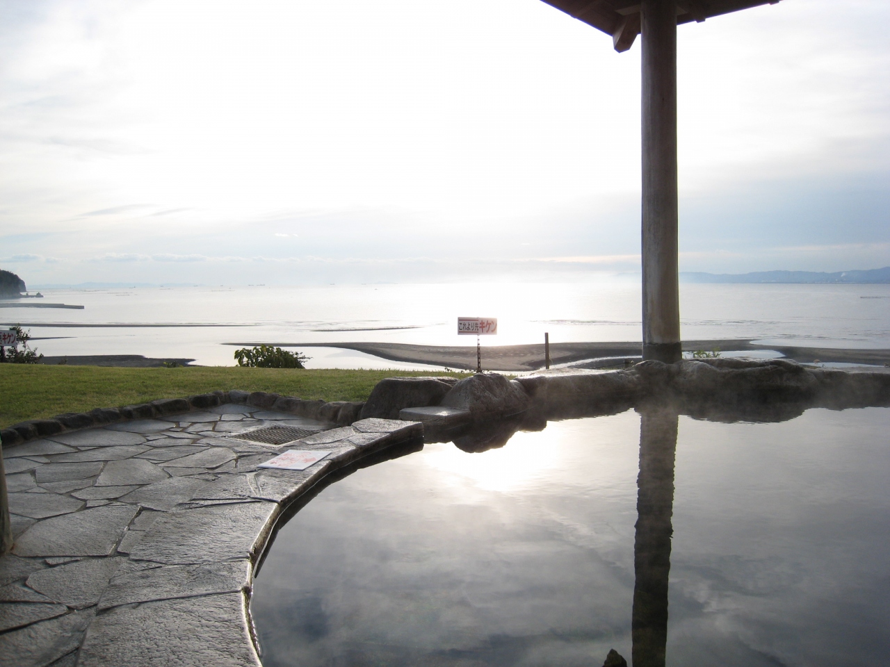 露天風呂から日の出がみえるはずでしたが、私が行った日にはあいにく雲がかかっており、その雲が切れるまで、見えませんでした。