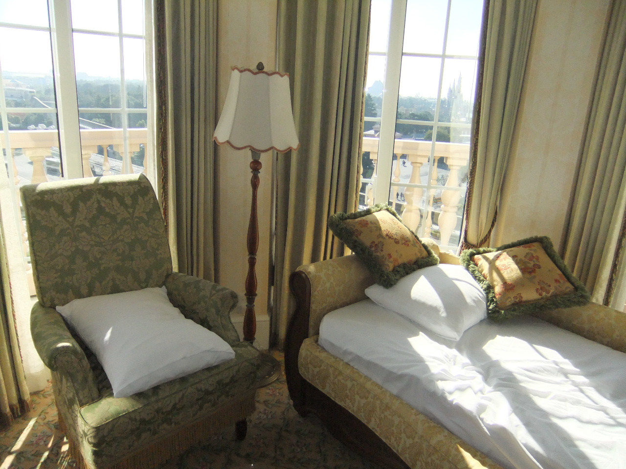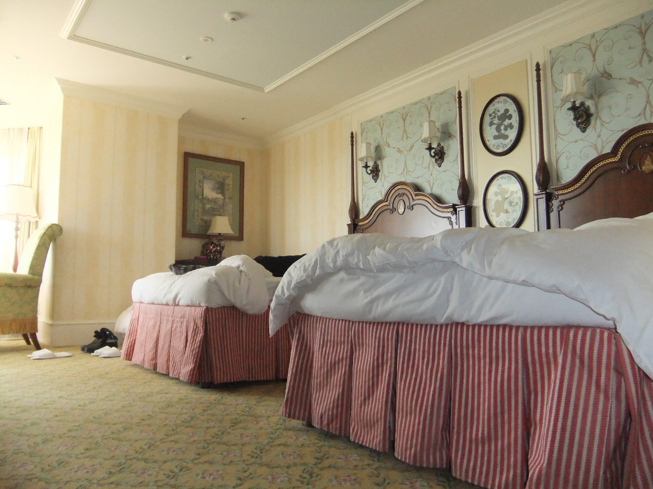 タレット(小さな塔)の中にある広いお部屋です。しかもコンシェルジュのツインでパークビューは1部屋のみで7階にしかない為、外に出られるテラス付きのお部屋になります。大人4人でも広く感じられました。追加ベッドもソファーべッドも大きくて十分なザイズです。お部屋も御料理も未体験レベルで豪華でした。高級ホテルは多々宿泊しましたが、御料理の素晴らしさではこちらが最高でした。4人で朝食付きで8万円程度でしたのでディナーバイクングも4人で2万円(ドリンク付き)を追加できました。駐車場は48時間で2000円ですのでお得です。ホテル玄関前がモノレールの駅で、駅のゲートをくぐると、そこはもうパークのチケット販売&入場ゲートですので、ホテル玄関を出て入場ゲートまでのんびりでも3分もかかりません。