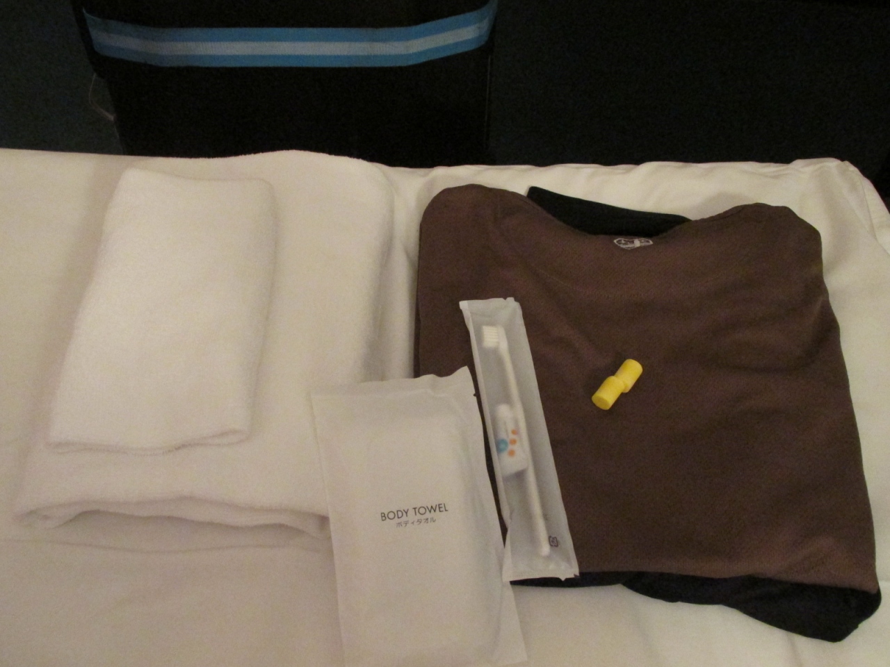 アメニティ(化粧落とし含)、ドライヤー、タオル(大小)、パジャマ、スリッパ・・、