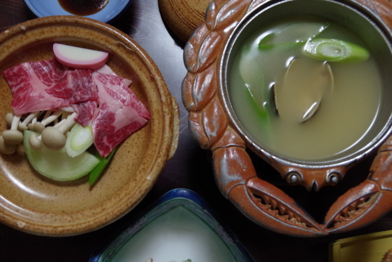 夕方6時過ぎに到着し、部屋に案内されると、すでにテーブルの上には夕食が用意されていました。肉の陶板焼き、ニシンの煮付けなどテーブル一杯に。そして真ん中には毛蟹が。予想していた以上に大きく、そして身もしっかり詰まったどっしり重い毛蟹に、ちょっと感激です。さらに、蝦夷アワビなどが入った新鮮な刺身や天麩羅、そして蟹飯は食事に付いてから出していただけます。