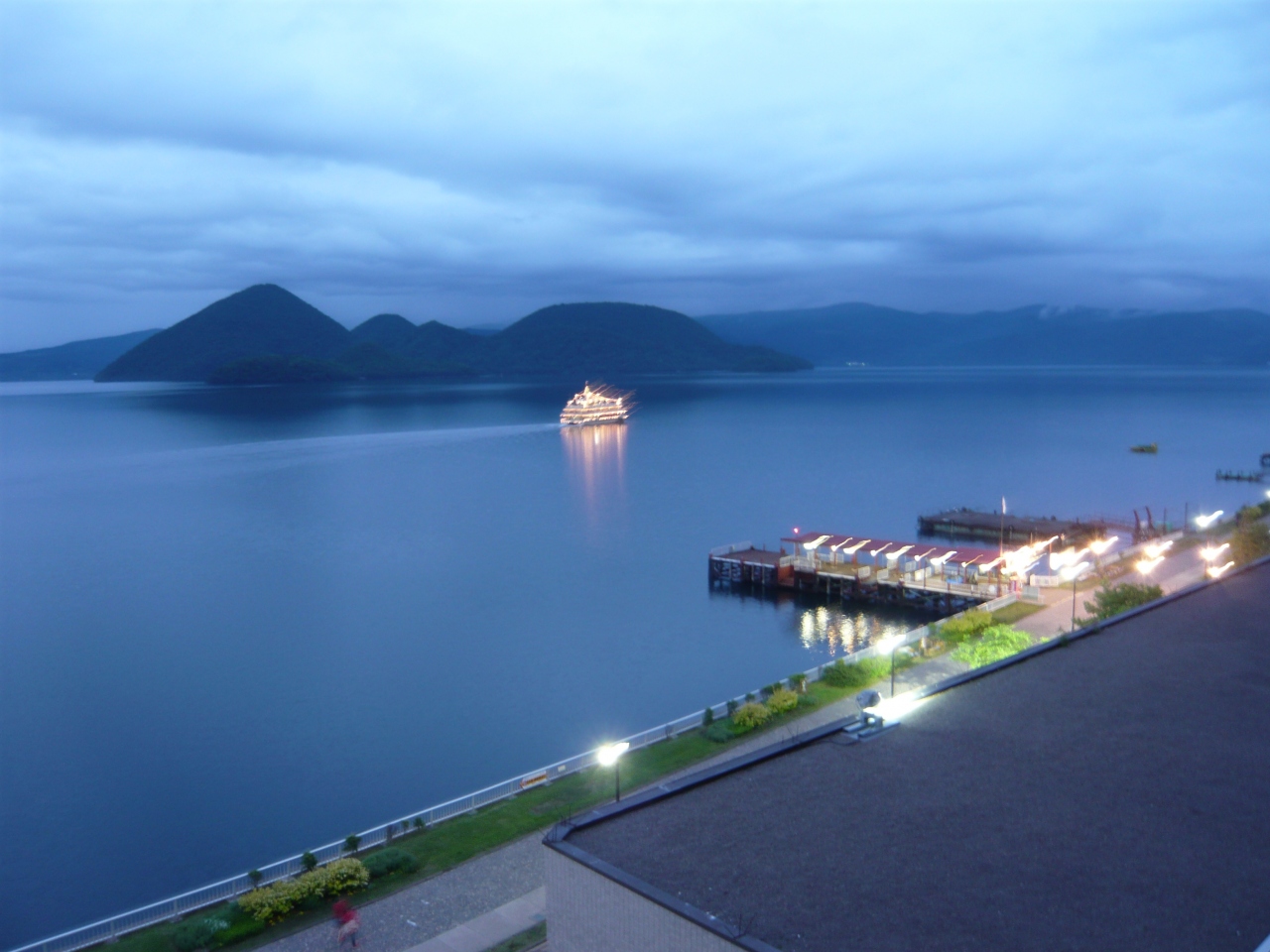 部屋から、洞爺湖と中島がどーんと眺められ、まさに、宿名そのものの「レイクビュー」で大感動ものでした!花火は、8時45分から、湖上の船が、西から東へ移動しながら、ホテルの前に泊まって打ちあげられます。夕食を8時からビュッフェレストランの窓側席で頂いたので、正面で花火を見ながら食事を楽しめました。