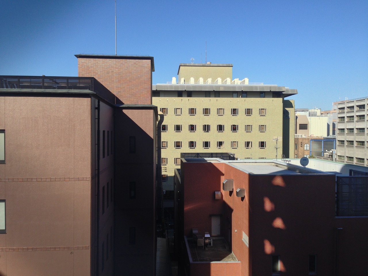 エレベーターを降りると、各フロアに入る為には、ルームキーをかざして入る扉を開ける必要が有るので、セキュリティの面で安心出来るかなと思いました。今回は約20?のスーペリアシングルに滞在。1人では十分な広さの部屋ですが、廊下で誰かが話していると、部屋の中まで結構大きく声が響きます。又、一見掃除はきっちりしているように見えますが、バスに髪の毛が落ちていたり、蛇口の根元に水垢がこびりついていたりと、甘い部分が有るように感じました。部屋の窓からは烏丸御池側、ちょうど三条通りの三井ガーデンホテルが有る側でしたので、眺めはあまり良く無かったです。ただ、広めの寝心地の良いベッドは気持ち良く、頭元のコンセントは便利でした。