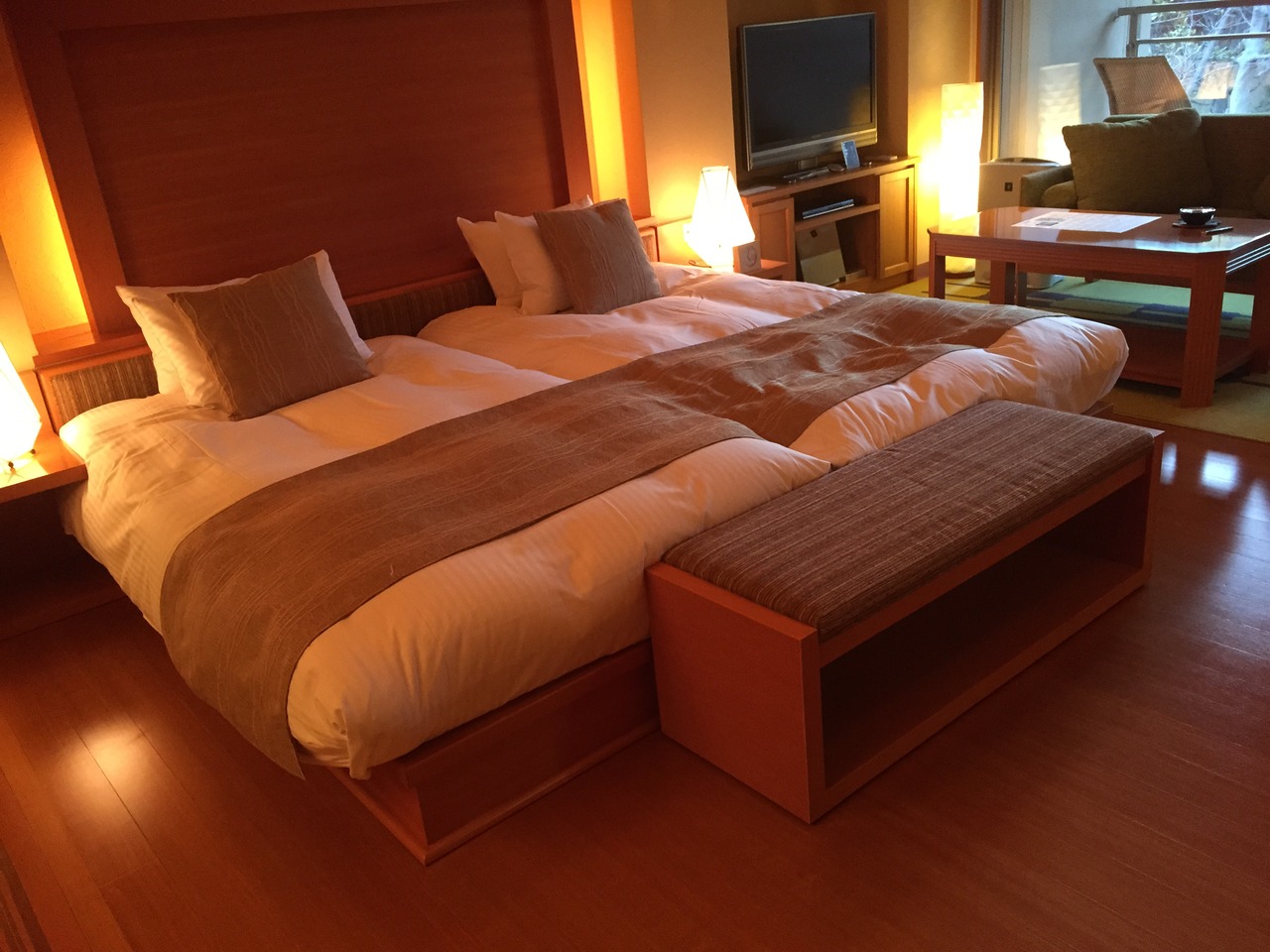 ツインベッドに、和室があり。