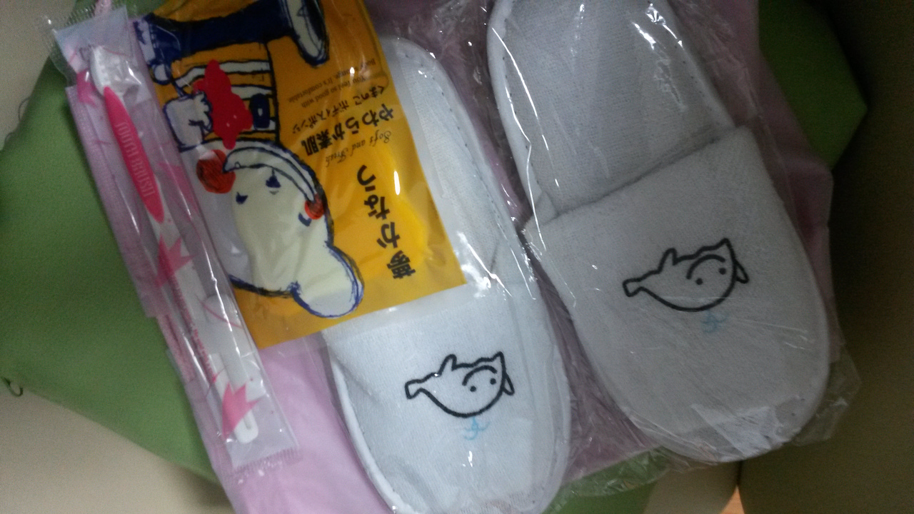 フロントで2才女児用のアメニティをいただきました。スリッパが可愛い‼お風呂用のスポンジや、歯ブラシセット。国際フェリー乗り場が近いので、中韓の人が多いです。駅から徒歩で行けますが、雨風の日は吹きっさらしで大変です。すぐよこに海峡ゆめタワーがあります。