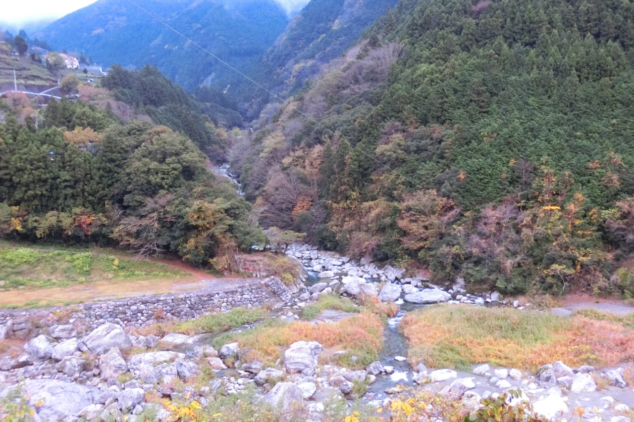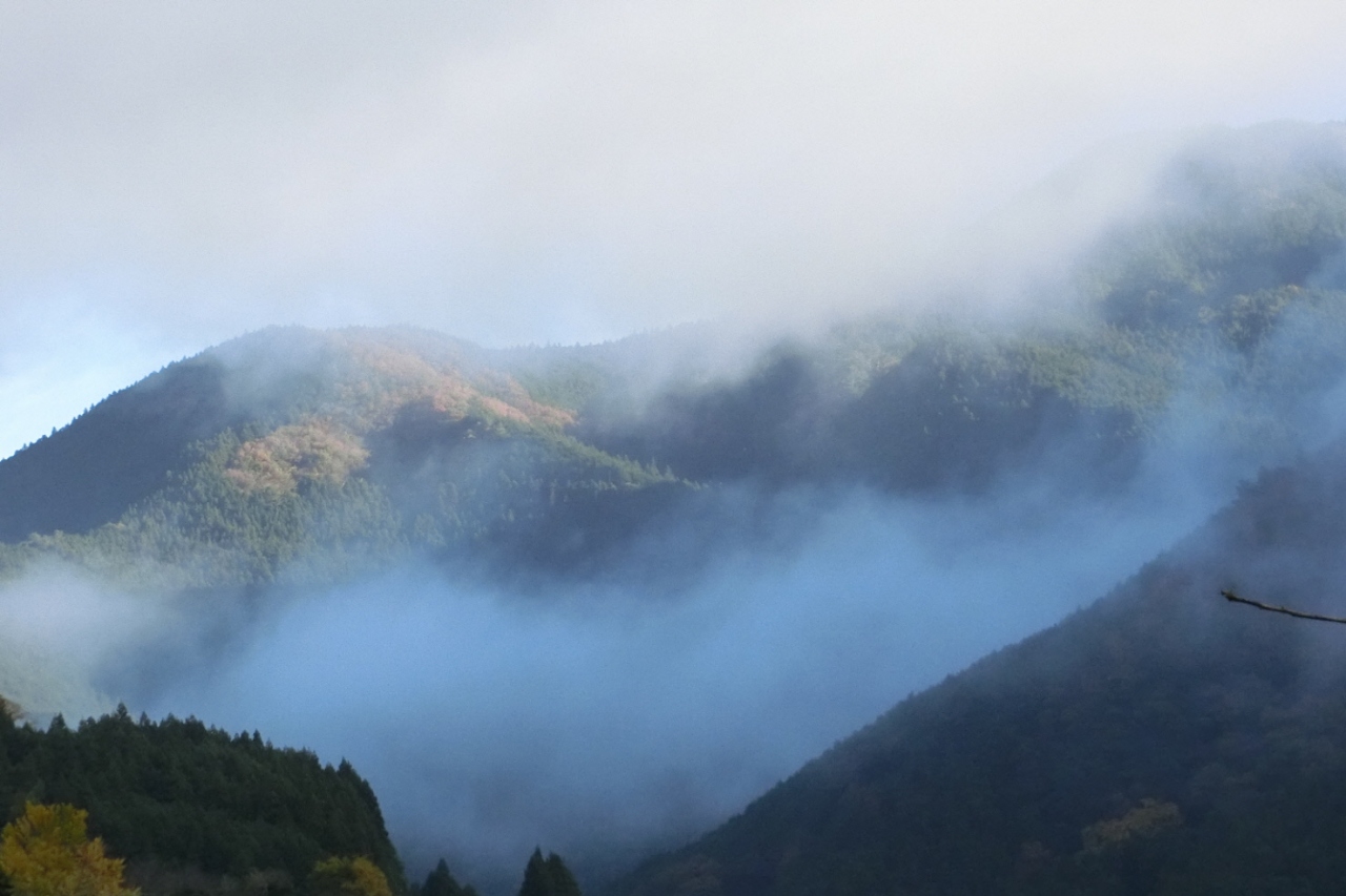 民宿は坂を少し上った離れになっている。といっても立派な一戸建て。部屋は4つかそれ以上。風呂は貸切。そこに夫婦二人だけで泊まる。食事は下の食堂でいただく。名物芋煮や鮎の塩焼き、地元のシイタケ、自然薯?など、地産地消そのもの。これがまたおいしい。焼酎によくあうし食べきれないほど。おまけに一家総出のもてなしがさりげなく続く。