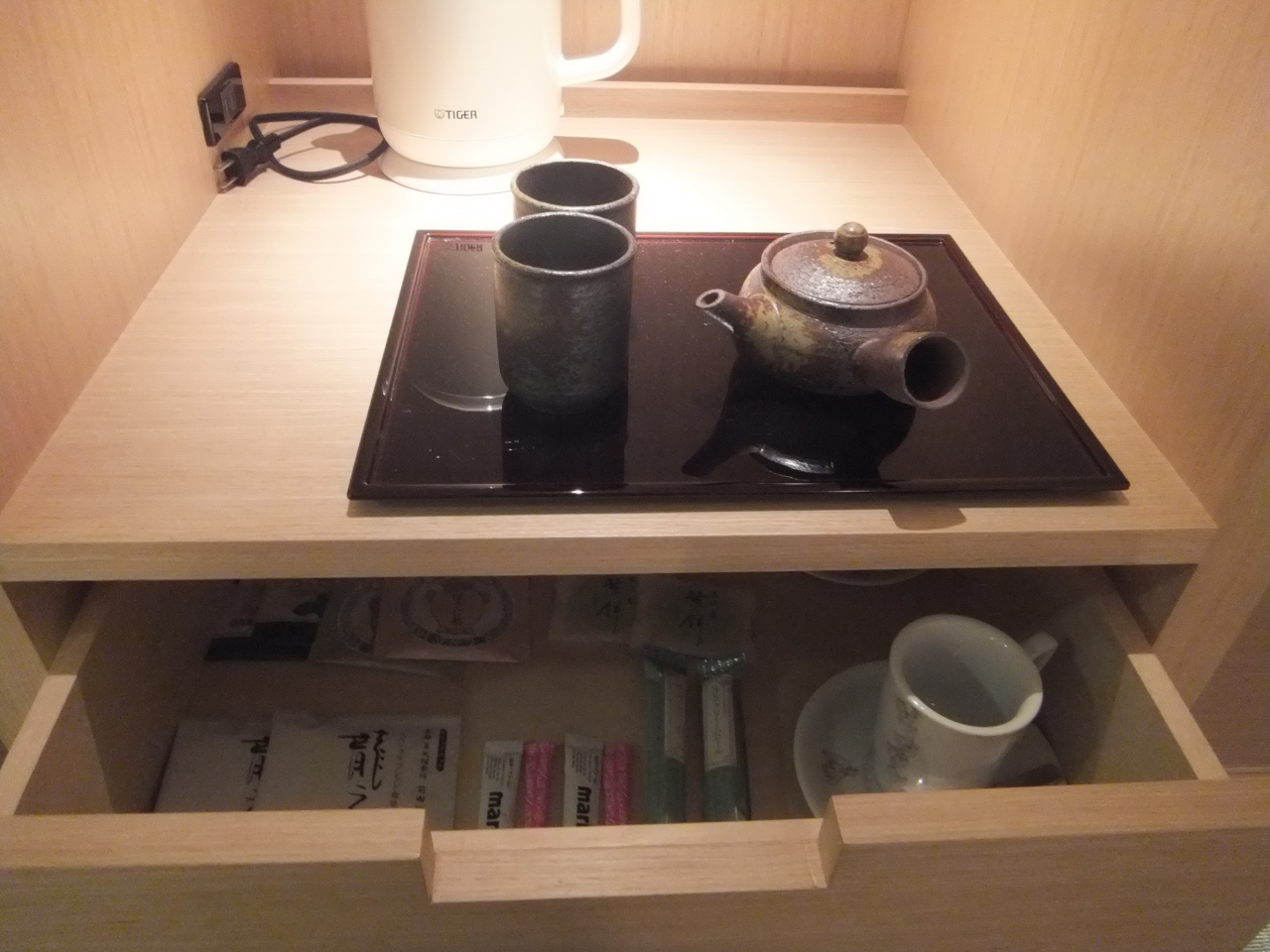 お部屋の飲み物も充実していてペットボトルのお茶がサービスで用意されており、ちょっとしたお菓子が用意されていたのも嬉しかったです。