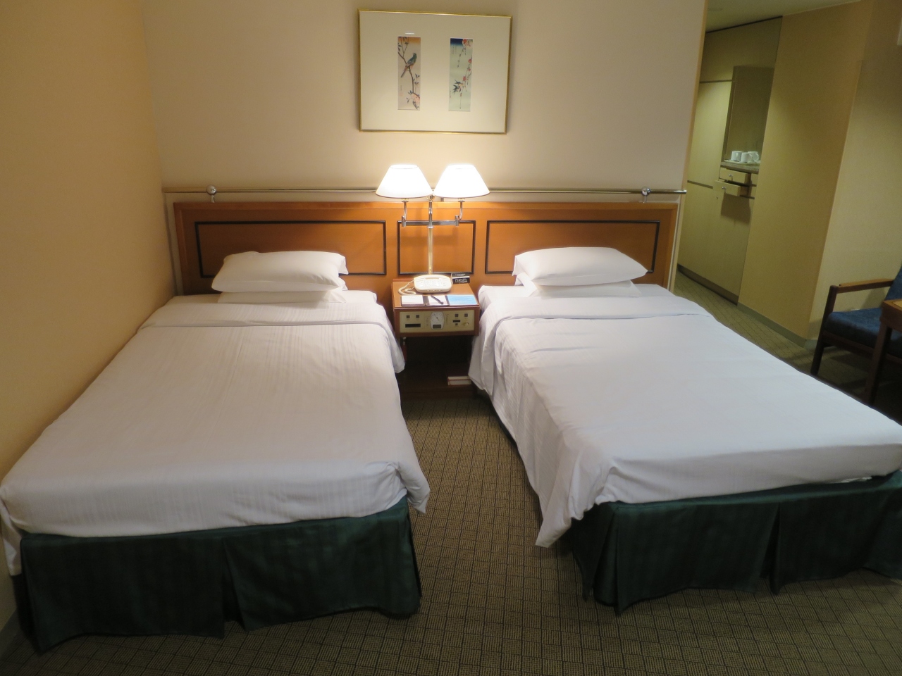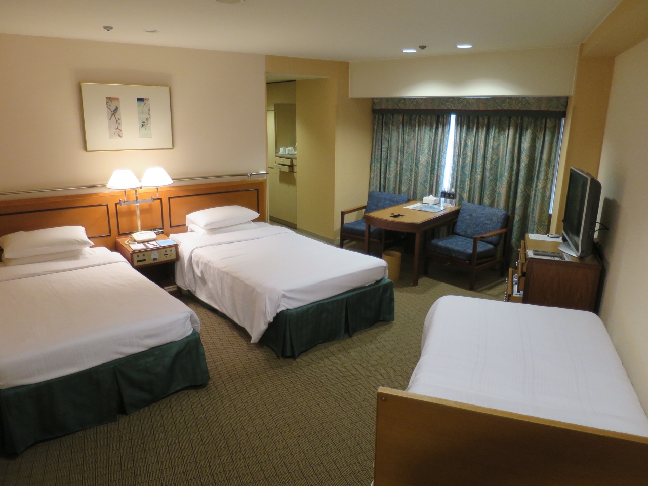 今回利用したのは曲線が美しい超高層ビルが特徴のガーデンタワー。元々はツインで予約していましたがチェックイン時にツインが満室とのことでトリプルルームに変更となりました。ベッドが一つ増えても利用しませんが、その分客室面積が広くなったのとトリプルルームの位置はエレベーターから近いので利便性は増します。尚、エレベーターホールに近くなっても騒音などの問題は感じませんでした。