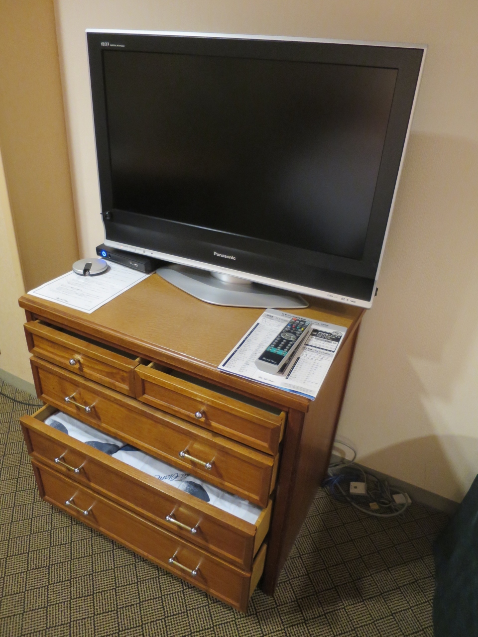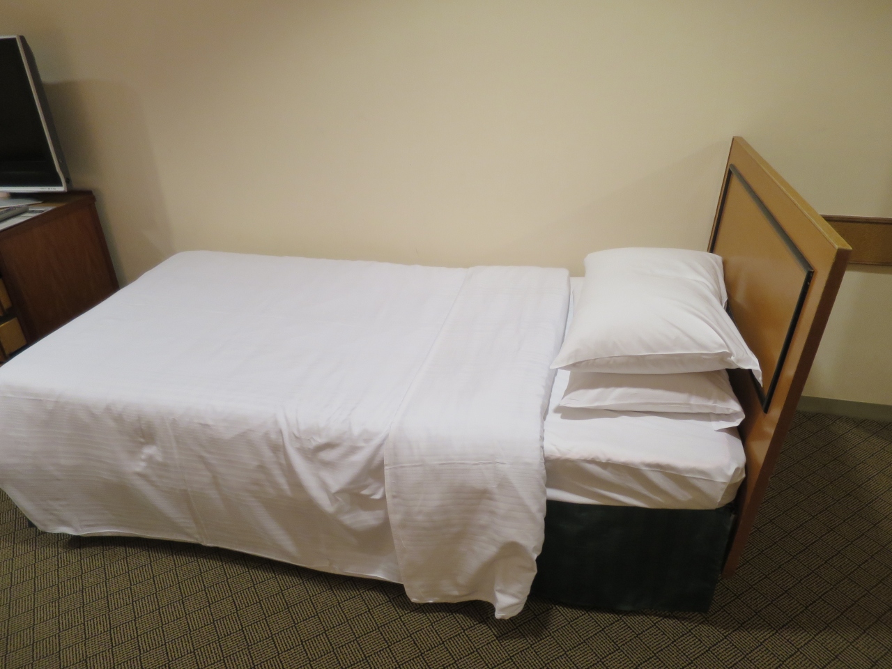 ベッドのマットはやや硬めの印象でスプリングの感触を背中に感じるようなものであり少々寝辛かった印象です。寝間着も糊の効いた浴衣だったことから、どことなく地方の巨大温泉ホテルに泊まっているかのような雰囲気を味わいました。