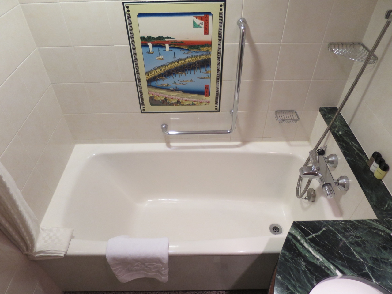バスルームのタイルには浮世絵がプリントされているのは訪日観光客向けなのでしょうが江戸の風情があってよかった。ちなみにシャンプーなどのアメニティ類は小ボトルにはいったものです。