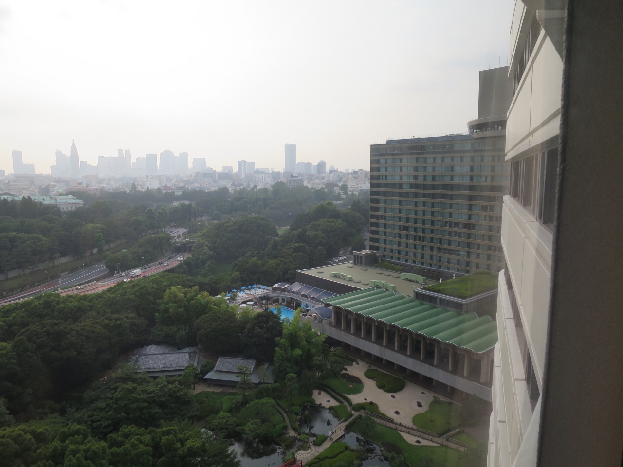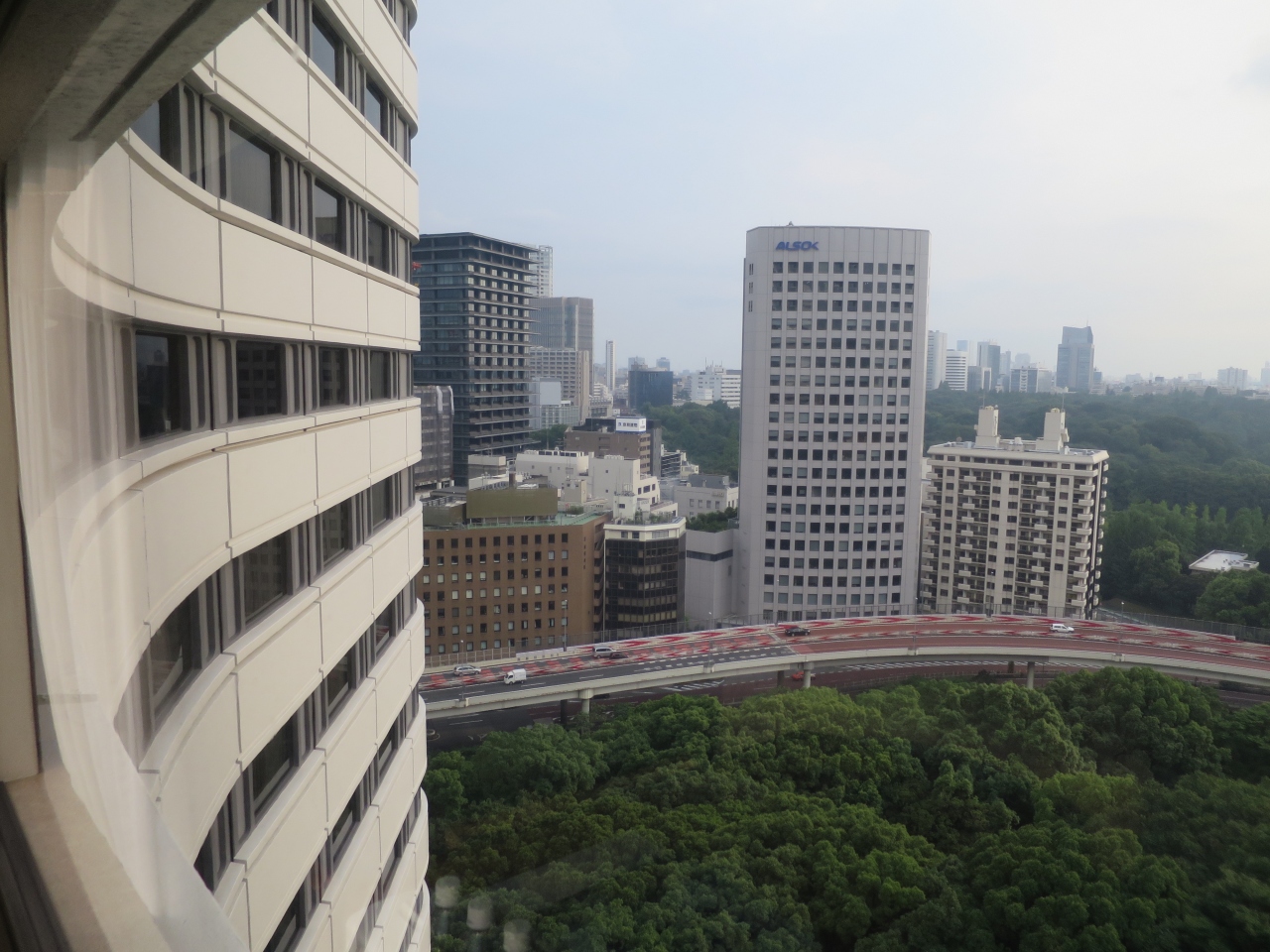 このガーデンタワーの最大のウリは窓外に広がる東京の眺望だと思います。ホテル敷地内の庭と赤坂御所そして外苑の緑が広がる様は、東京にはこんなにも緑があったのかと再認識させられるものでした。客室によって見える景色はだいぶ違うと思いますが、西方向が見える客室ですと眼下に延びる首都高速4号船の車の波と相まって美しい東京の夜景を堪能できます。