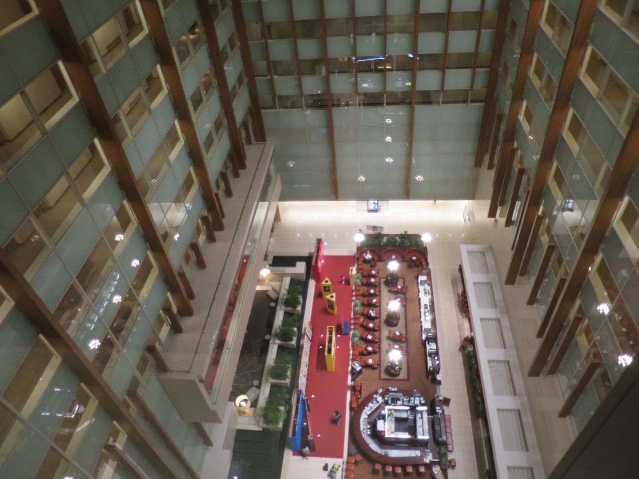ホテルのフロントがあるフロアは宿泊客以外でも利用できるレストラン街などもあり、その上の客室階に向けて大きな吹き抜けとなっていて開放感があります。客室階に向かうエレベーターはルームキーがないと作動しないタイプなのでセキュリティ面でも安心です。新しいビルだけに館内は非常に綺麗で、落ち着いた雰囲気が高級感を漂わせています。