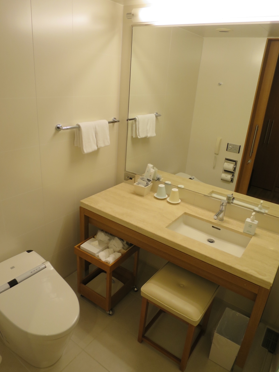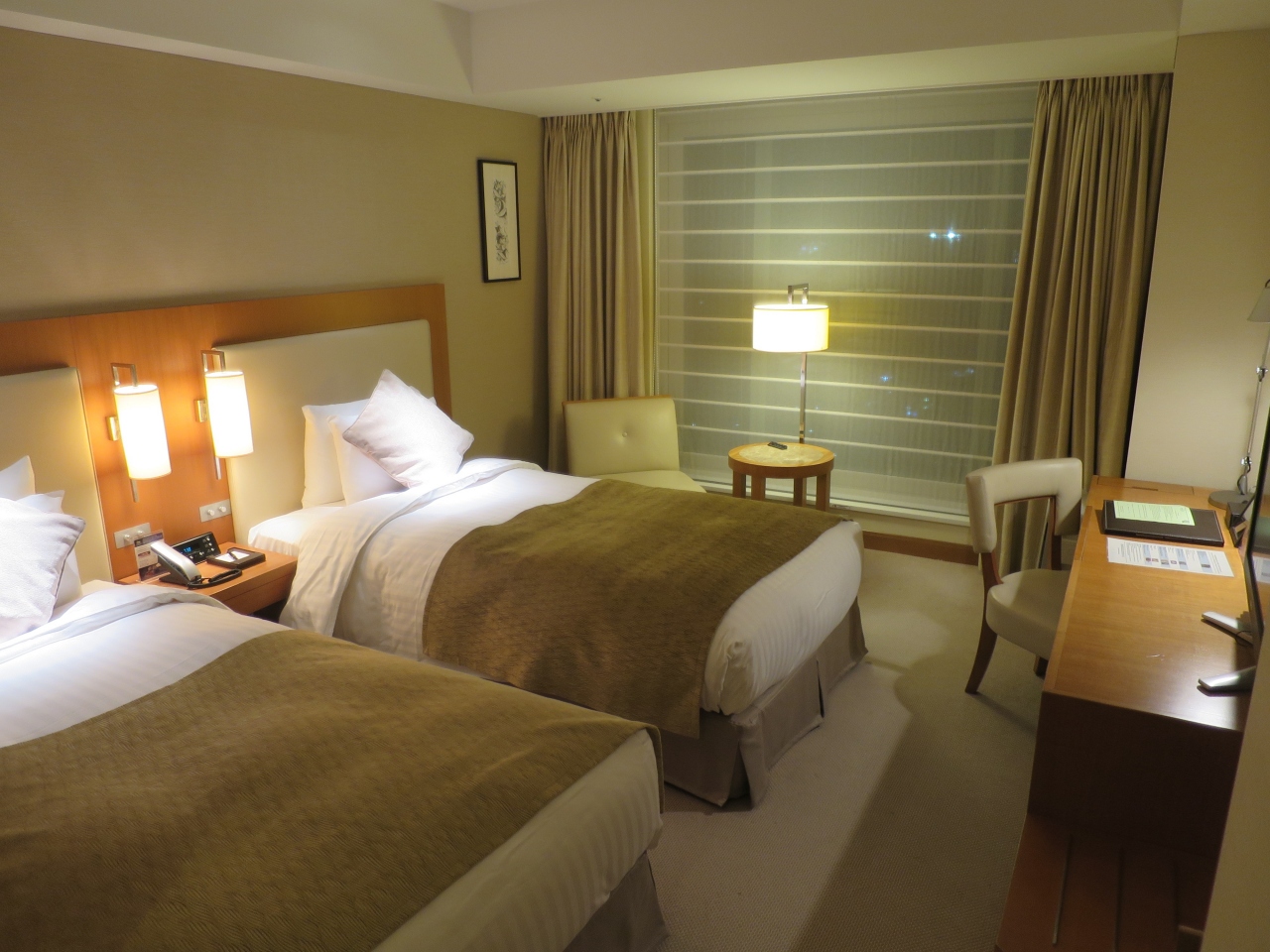 ツインルームを利用しましたが部屋面積はごく普通で外資系ホテルのような広さはありません。エアコンや空の冷蔵庫、空気清浄機などビジネス利用に欠かすことのできない設備は一通り揃っている印象です。机上の電源コンセントは未使用時は蓋ができる造りで使いやすい設計となっています。