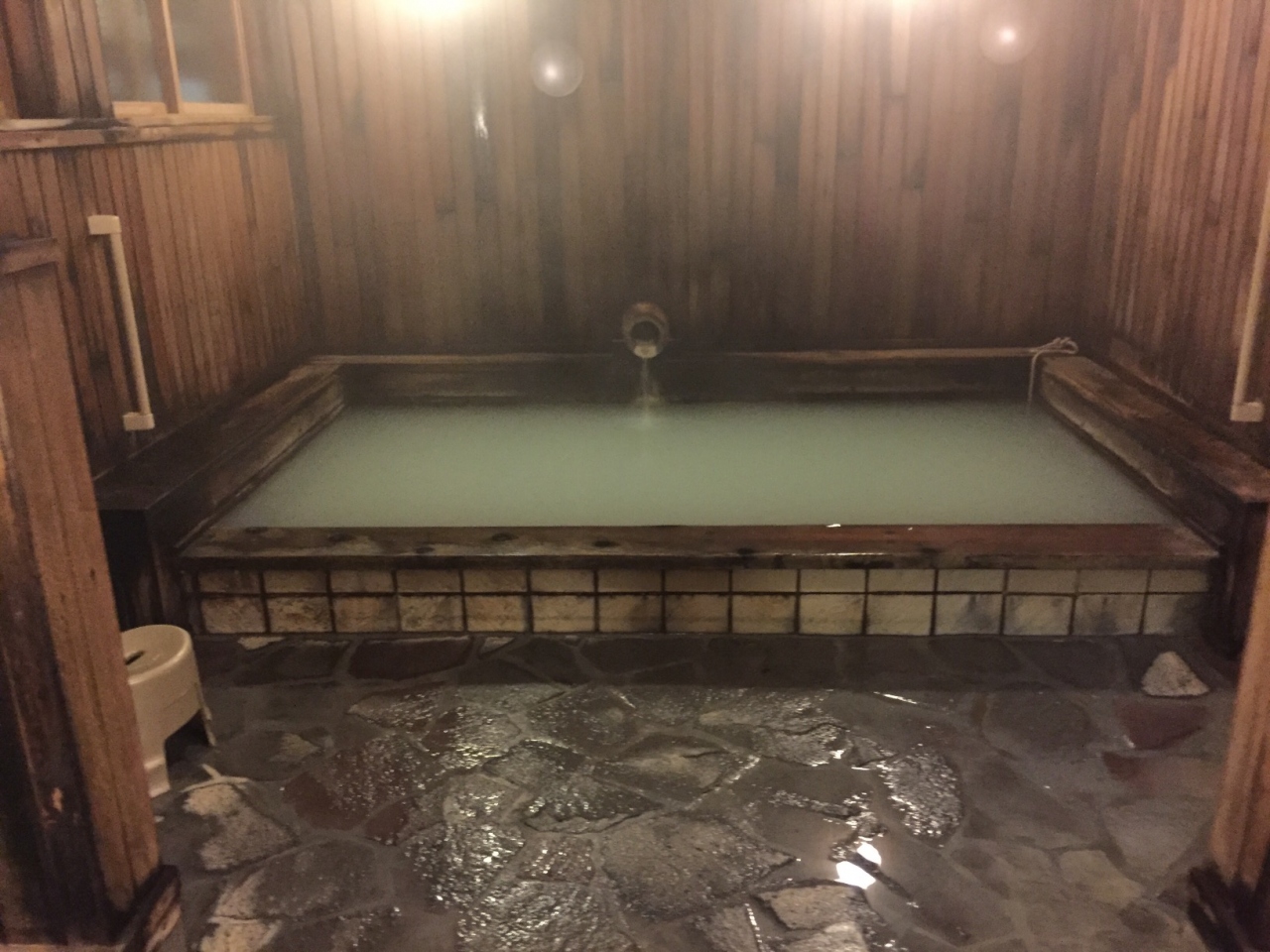 白濁の強酸性の湯は、長湯すると少々疲れる。