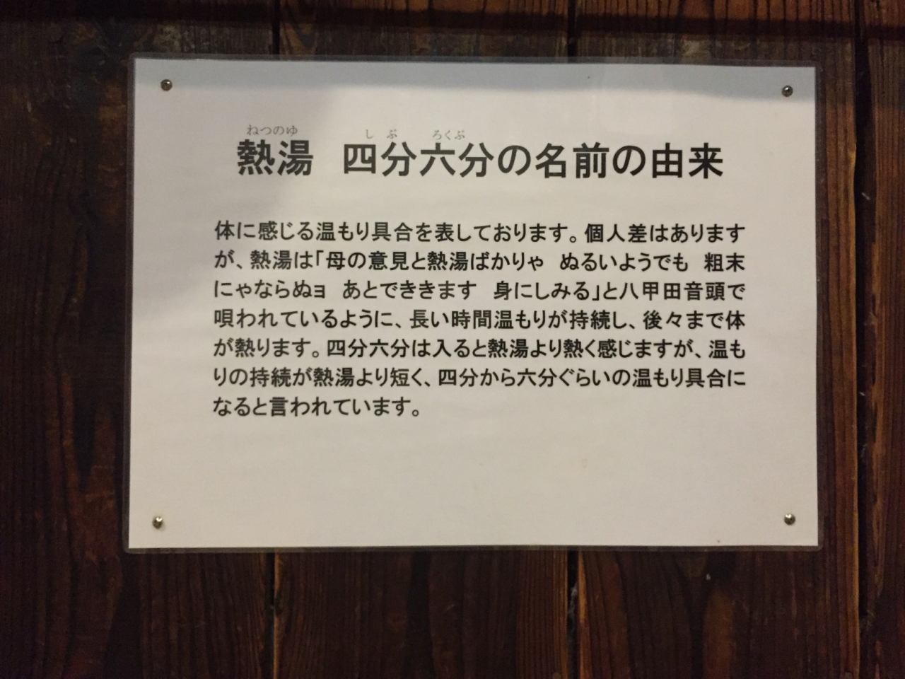 四分六分(しぶろく)の方が、熱湯(ねつのゆ)より温度が高いが、温もりの持続が短く、体には四分から六分くらいの温もりになるから、そのような名が付けられたとのこと。