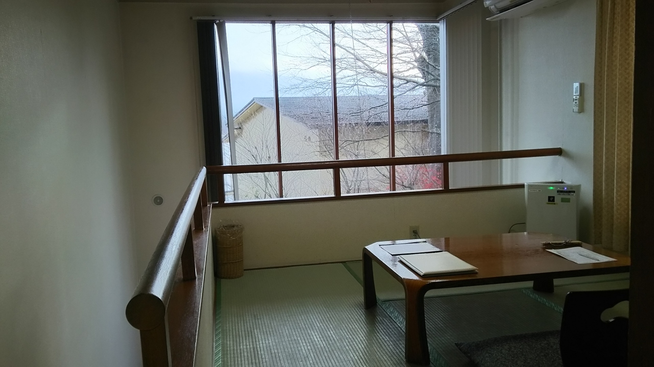 洋館は、階段を挟んだ両側にメゾネット、階段上にツインがあります。メゾネットは、入るとトイレ・お風呂・冷蔵庫・流し・和室があって、階段下にデスク・応接セット・ベッドがあります。大きな窓からの眺望を楽しみにしていたので残念でした。