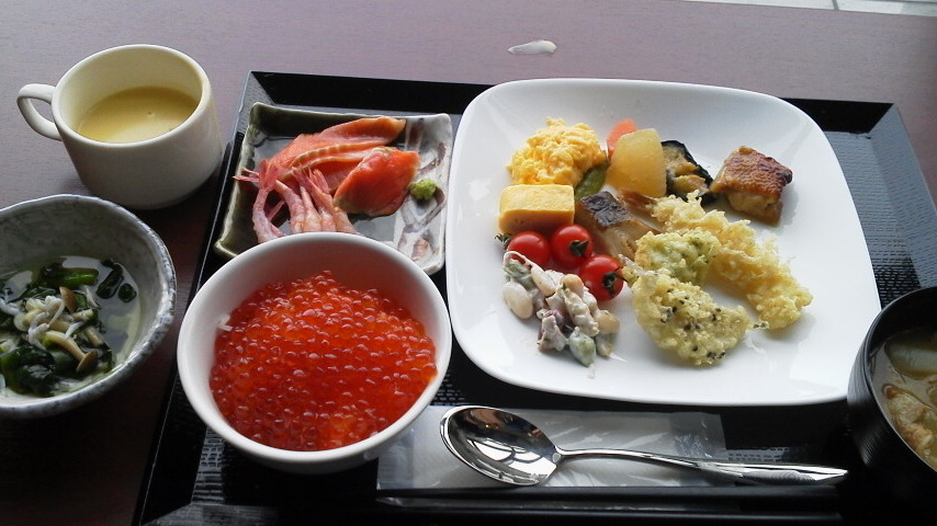 朝食にいくらがあり、盛り放題です。他にも天ぷら、お刺身などもあり、美味しいです。
