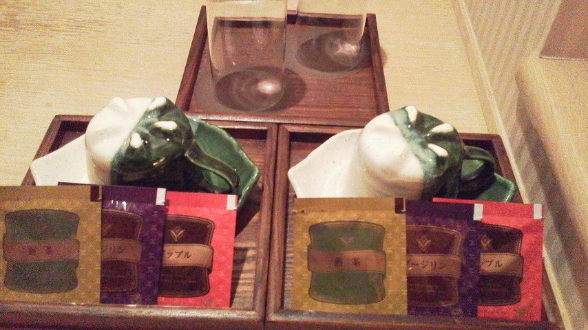 部屋にはお茶、紅茶など3種類の飲み物と陶器のカップが用意してあります。