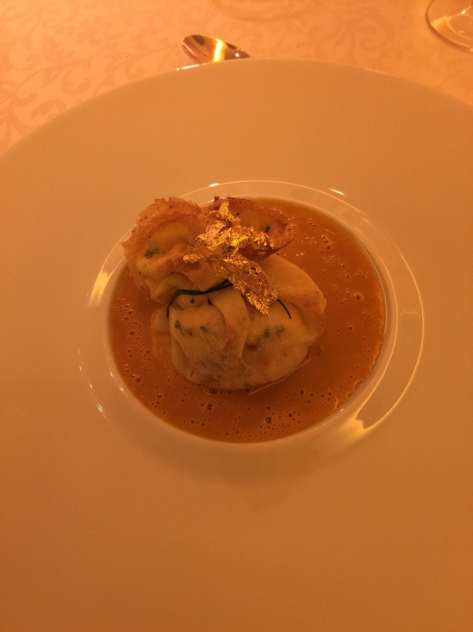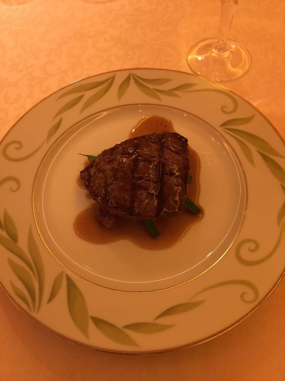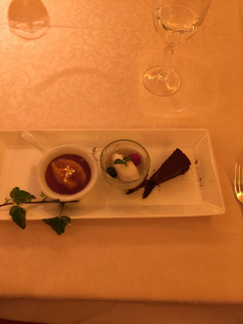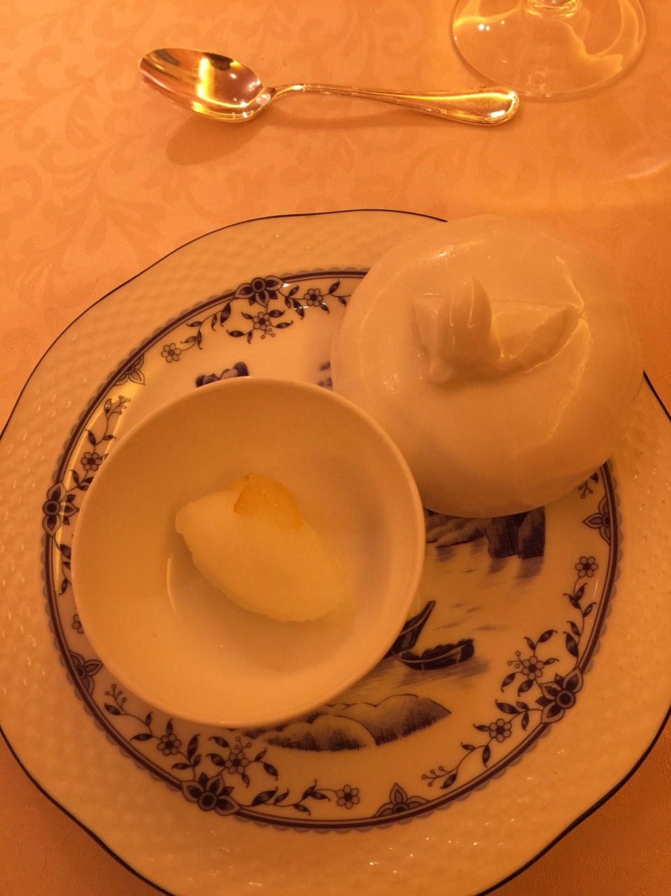 オマール海老と帆立貝のクレープ包み、柚子のシャーベット、フィレ肉の網焼き、デザート