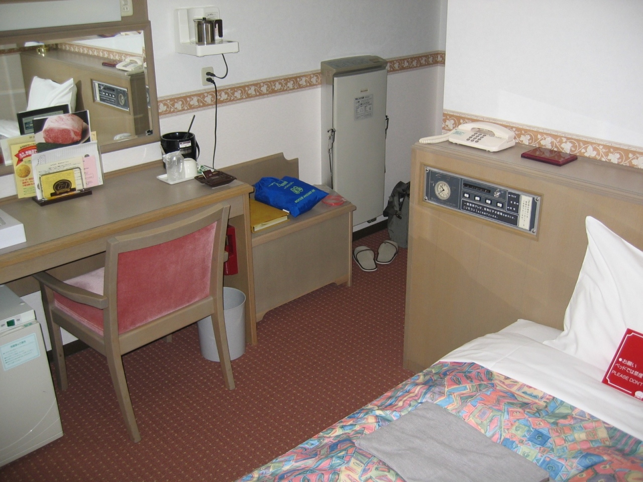 客室はアルファーワンなのでいつものベッドカバーと壁紙、そしてバスルームの配色なので特段言うべき事が見当たりません。アルファーワンを知らない方に伝えるのであれば、ごく普通のビジネスホテルということです。