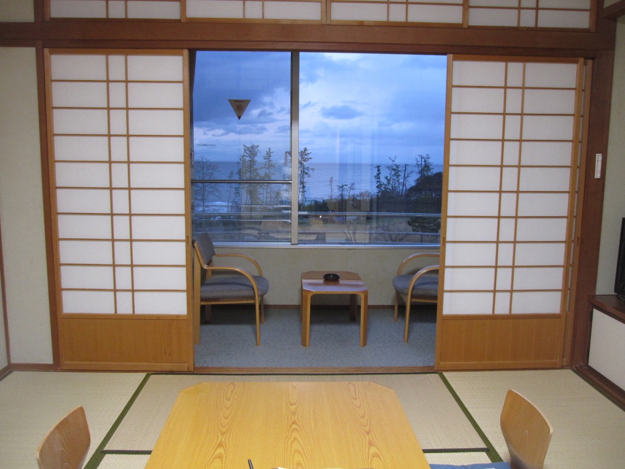 入浴は日本海を望みながら。海のそばなのでお湯はちょっと塩気があります。部屋の前もどーんと日本海。眺めはいいですね。