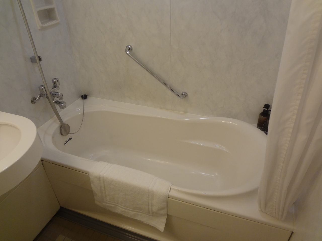 出張の夜はゆっくりとお風呂に浸かりたいものです。こちらのホテルはインと付きますが、以前はニューオータニと称して、れっきとしたシティホテルでした。その時代と基本的な構造的は変わっていないと記憶しているので、ひとランク上の快適性です。特にお風呂はバスタブが大きくて、身体を寝かせぎみの姿勢でお湯につかることが出来ます。これは良いです。特に冬の出張時には格別でした。
