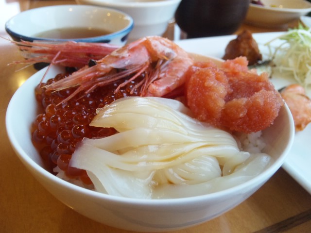 内容はとても充実していて、やはり海産物がウリなので新鮮な刺身も多種並び(朝食でもイカ・海老・イクラ・釜揚げシラス・タラコを好きなだけ盛れる海鮮丼を戴けます)、一口ずつ全種類戴きたくてもとてもとても食べ切れなかった程の種類でした。
