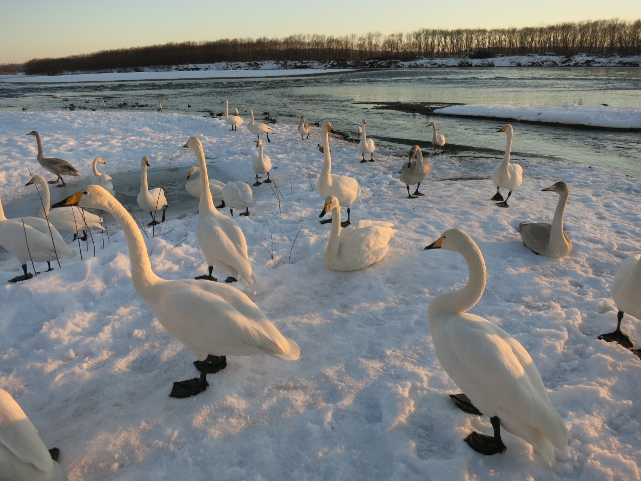 ご利用ありがとうございます。近い将来、全室禁煙にします。この地域に全室禁煙とする施設はないので、冒険だと思っていますが、時代はどっちに向かっているのか考えれば、間違っていないと思います。どの施設も喫煙には困っているはずです。当館が先頭を切ることにします。さて、写真の白鳥ですが、毎年10月~3月まで当館前で越冬します。先日黒鳥(コクチョウ)がいたと大喜びしているお客様がいました。残念ながら白鳥の幼鳥ですというと、絶対コクチョウだと。コクチョウはオーストラリア固有種で、渡りはしないので、十勝川温泉に来ることはありません。と説明し、恥をかかせてはいけないと思い、コック長は当館にいますと伝えておきました。残念そうでしたが納得してもらえたようです。この白鳥がシベリアに帰るころ、気の早い夏鳥がやってきます。さえずりが春を呼び込んでいる気がします。ぜひこの様子を見に来てください。私がガイドをします。お待ちしております。CS支配人 高橋亮
