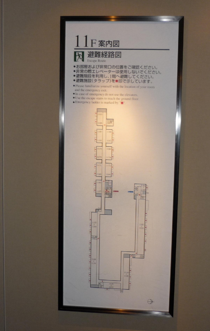まず一言、「非常に細長いホテル」。回廊するだけでも、良い運動になります。エレベーターから、廊下をそこそこ歩き、部屋に入り、まず目につくのが、1リットルのペットボトル(めずらしい)部屋で使うことだけなら合理的かもしれませんが、持ってでるには、不便です。禁煙部屋しか取れなかったので、煙草場所を聞くと、15階とのこと、少しわかりにくかったけど、行ってみると在りました。