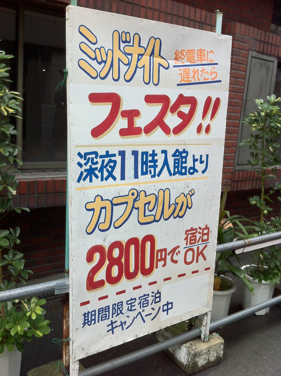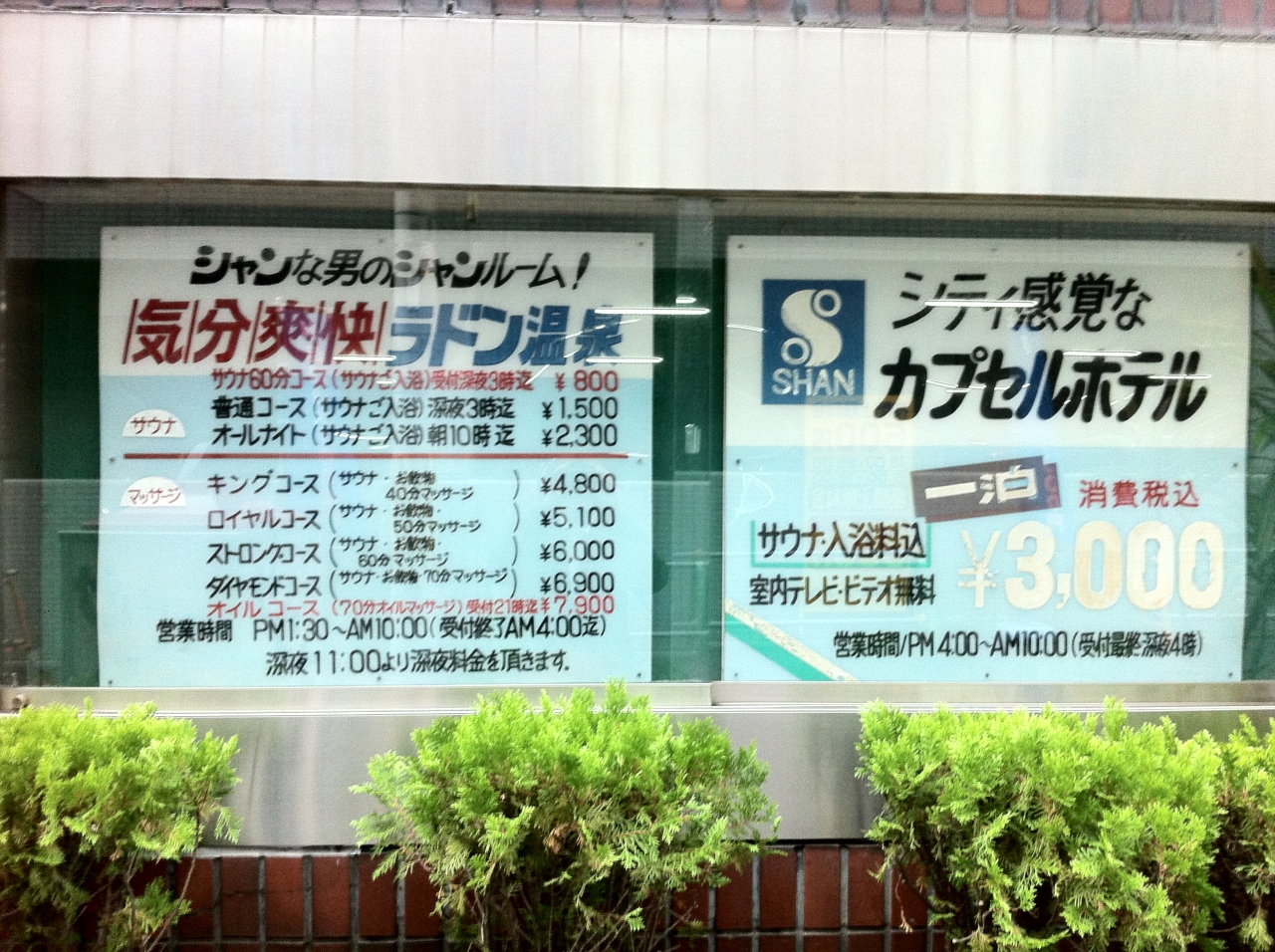 十三の老舗カプセルホテル、シャン、十三駅前交差点にドデカク古めかしい看板も目立ちますが、入口にある看板もすばらしくレトロで値段設定もずいぶん前からこの価格ようのです。内部もとても時代を感じさせる品々が垣間見れて私的にはお得感がありました。この周辺は風俗街的な場所も多く電車がなくなった人向けの施設として15年以上昔からありました。この他にも駅近にサウナがありました。