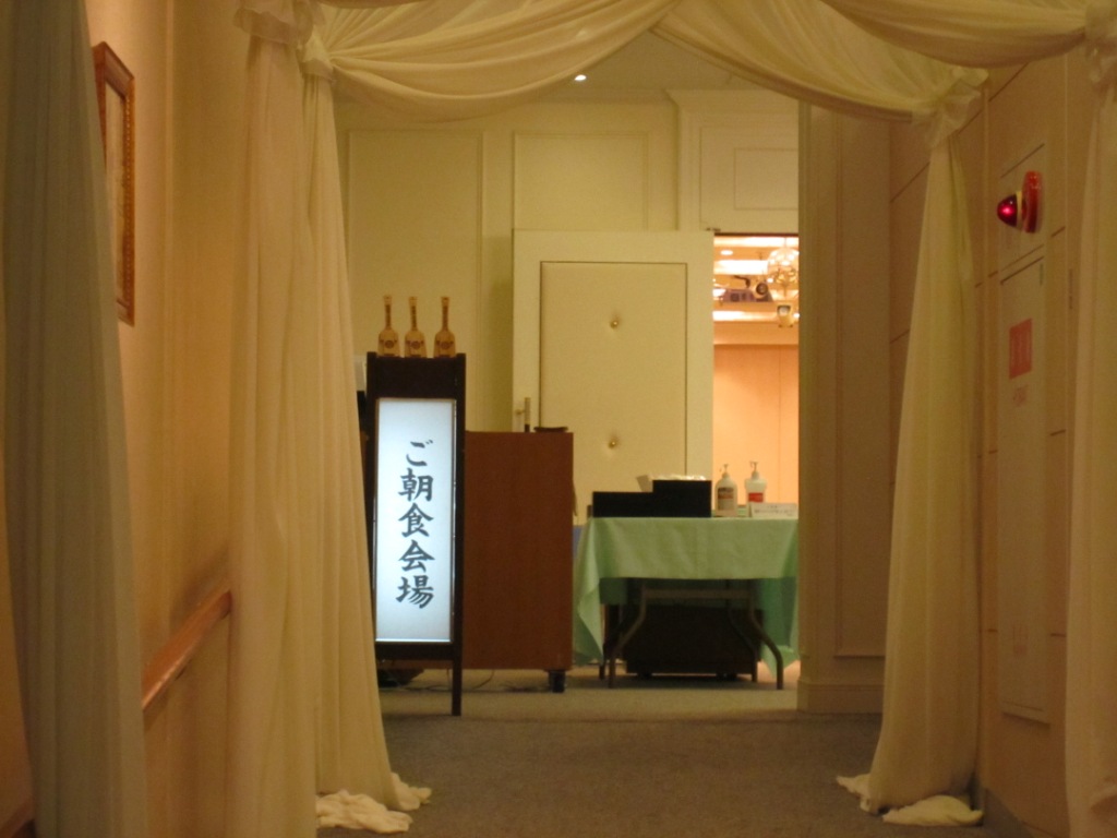 朝食会場は、結婚式場の一室みたいで、入口が豪華でした。朝ご飯もバイキングで、値段の割には種類も多くおいしくいただけました。