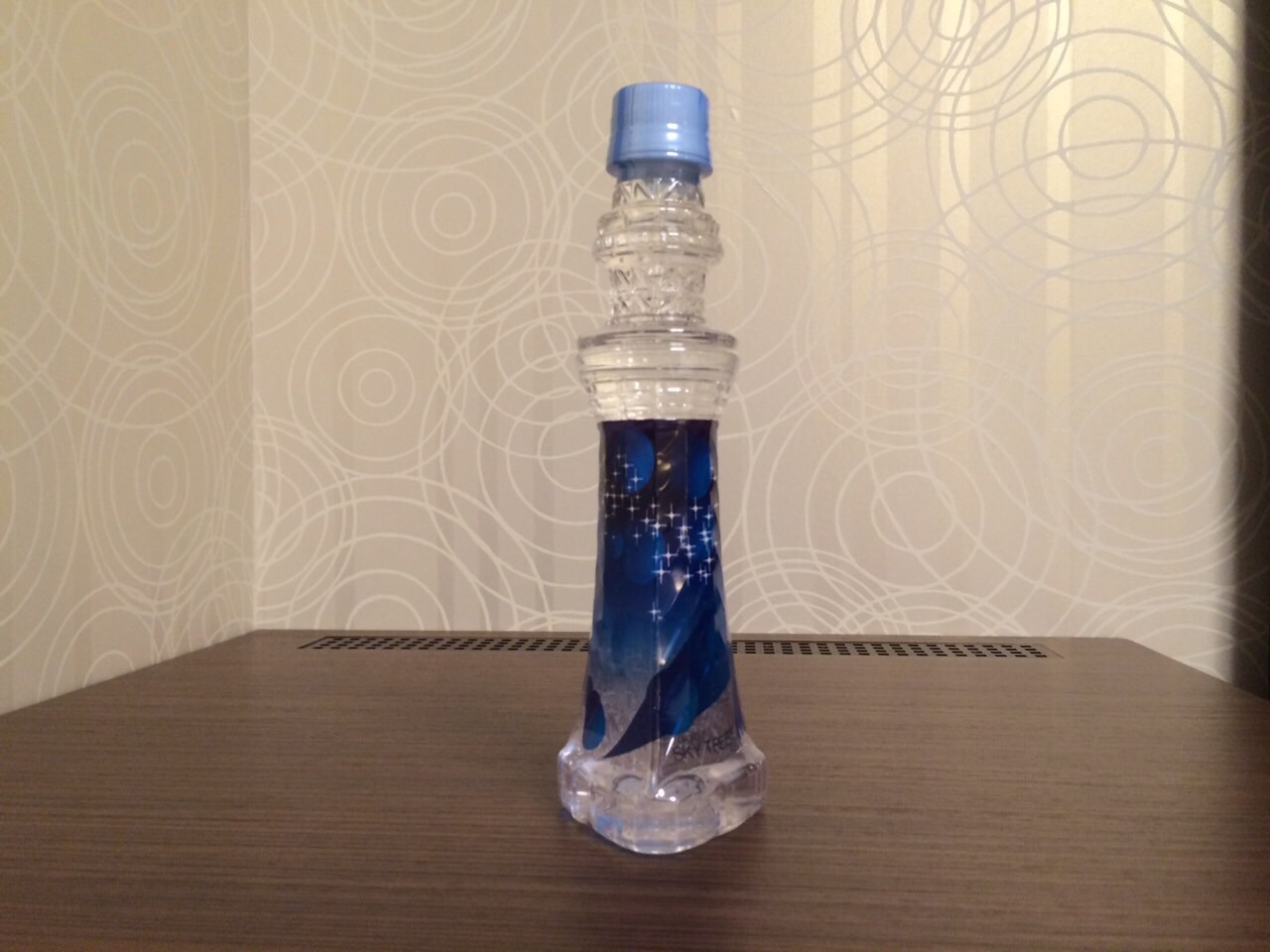 部屋はダブルベッド仕様のシングルルームでした。冷蔵庫がおしゃれだったり、スカイツリーの形のミネラルウォーターもおいておりました。