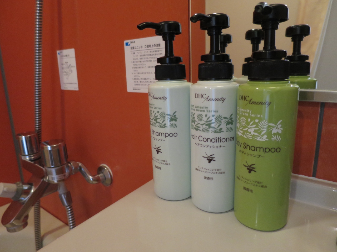 シャンプー類は大きめのボトル式を採用しています。ビジネスホテルではよく見かけるような壁面のタンクに納められた物よりは多少は高級感があります。また使用しているブランドがDHCである点も花王などと違ってチョッピリ贅沢な気分にさせてくれます。これなら女性客でも抵抗なく使ってくれるのではないでしょうか。
